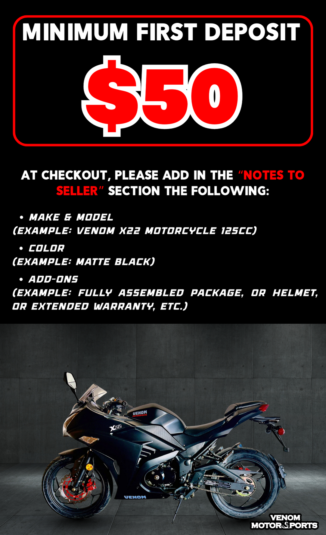 1. Make & Model (Example: Venom x22 Motorcycle 125cc)