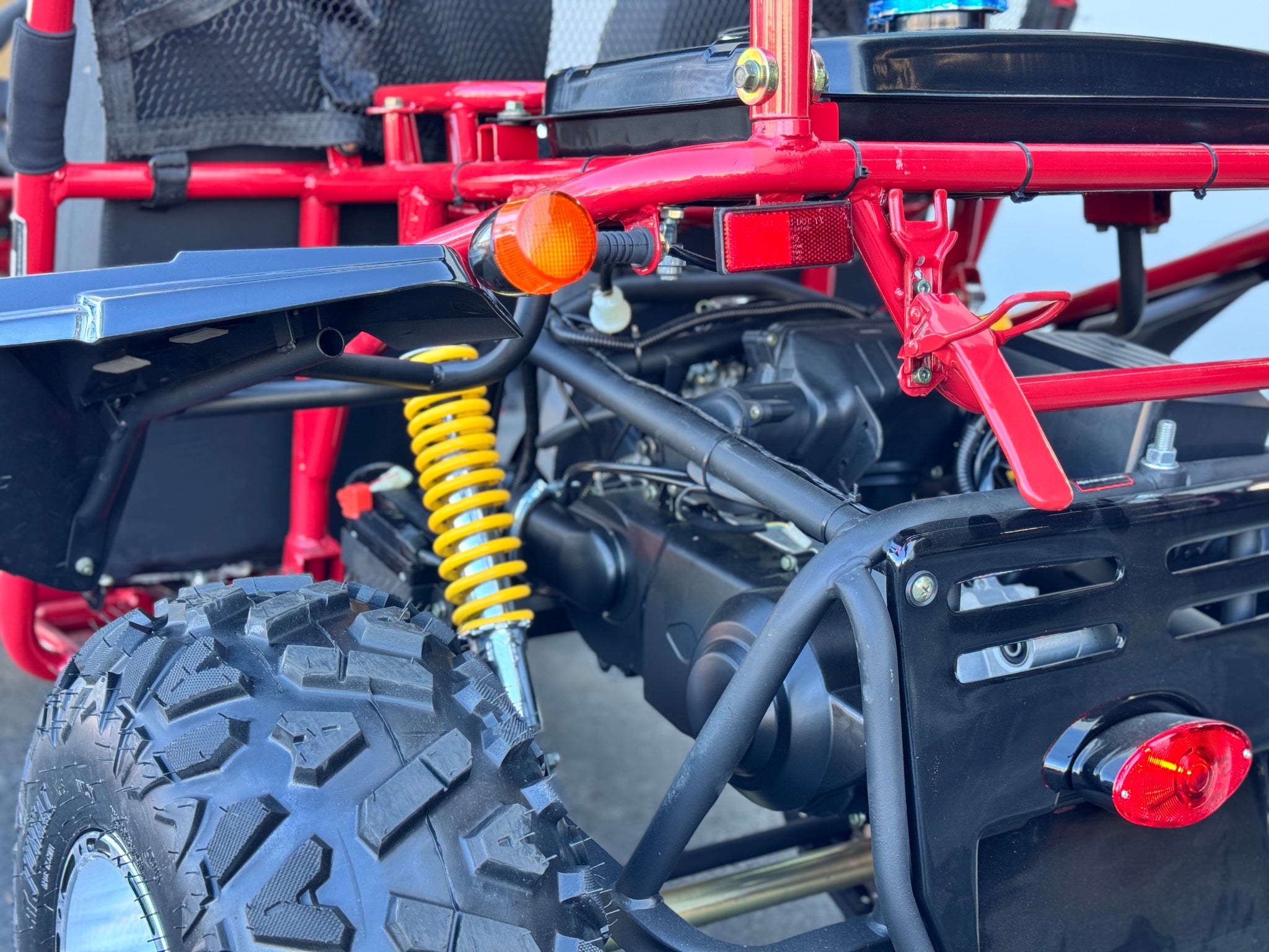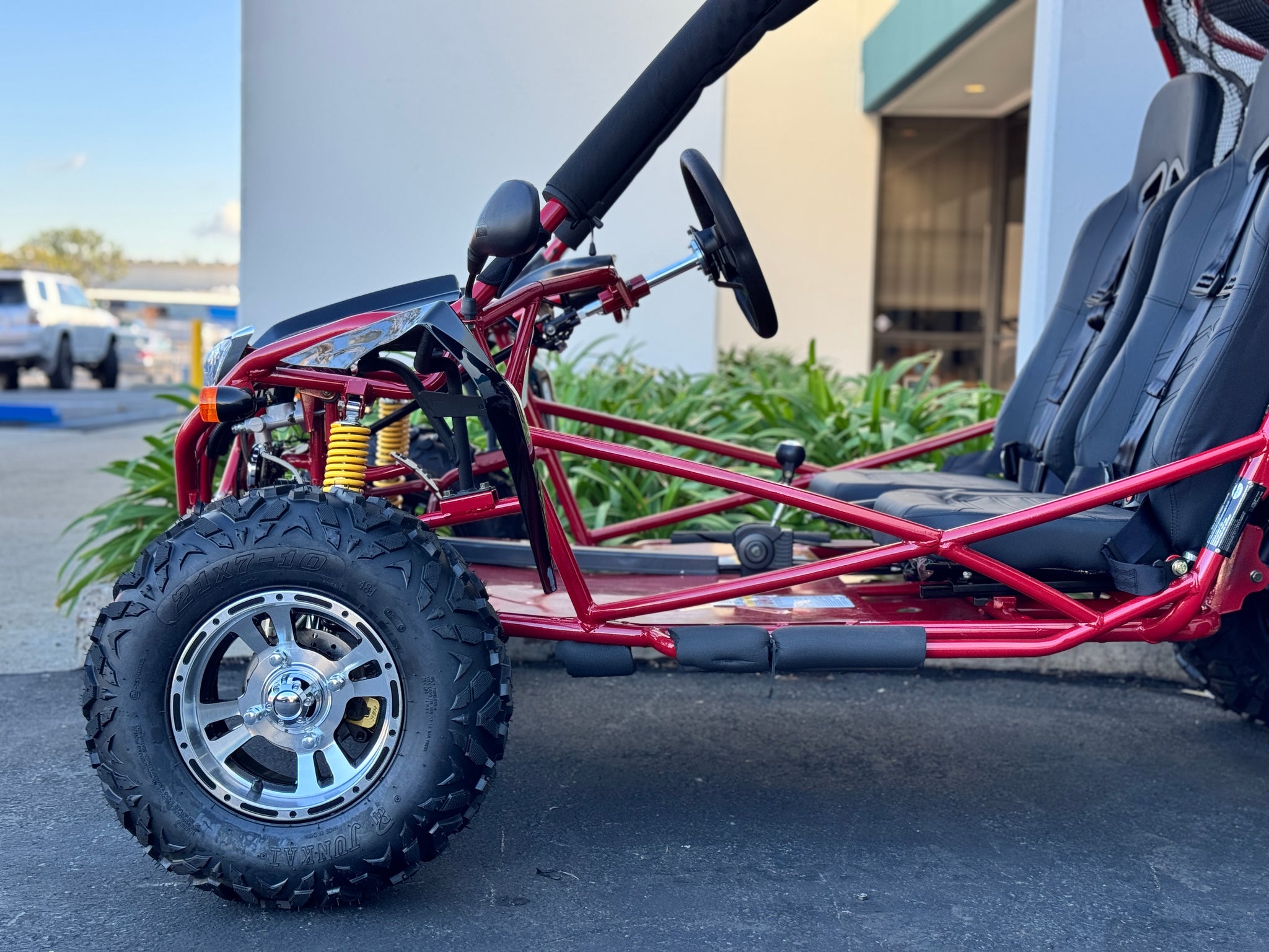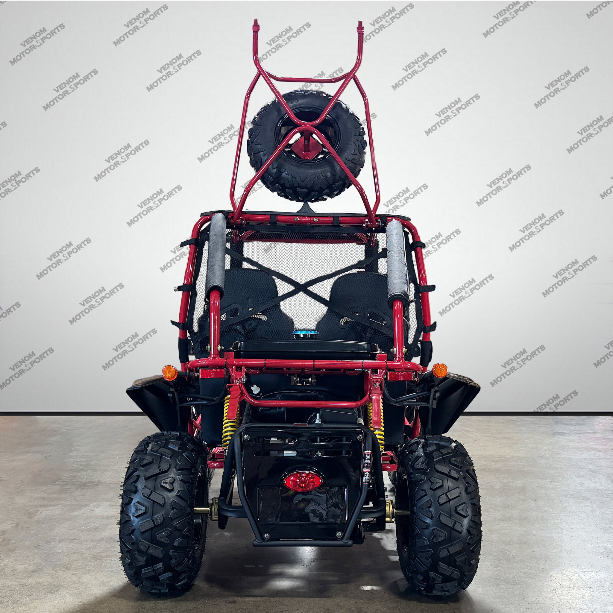 The 200cc Venom Captain Go Kart is a fully automatic 2-seater dune buggy with carbureted engine, headlights, chrome wheels, signal lights, seat belts, free spare tire and other premium features.