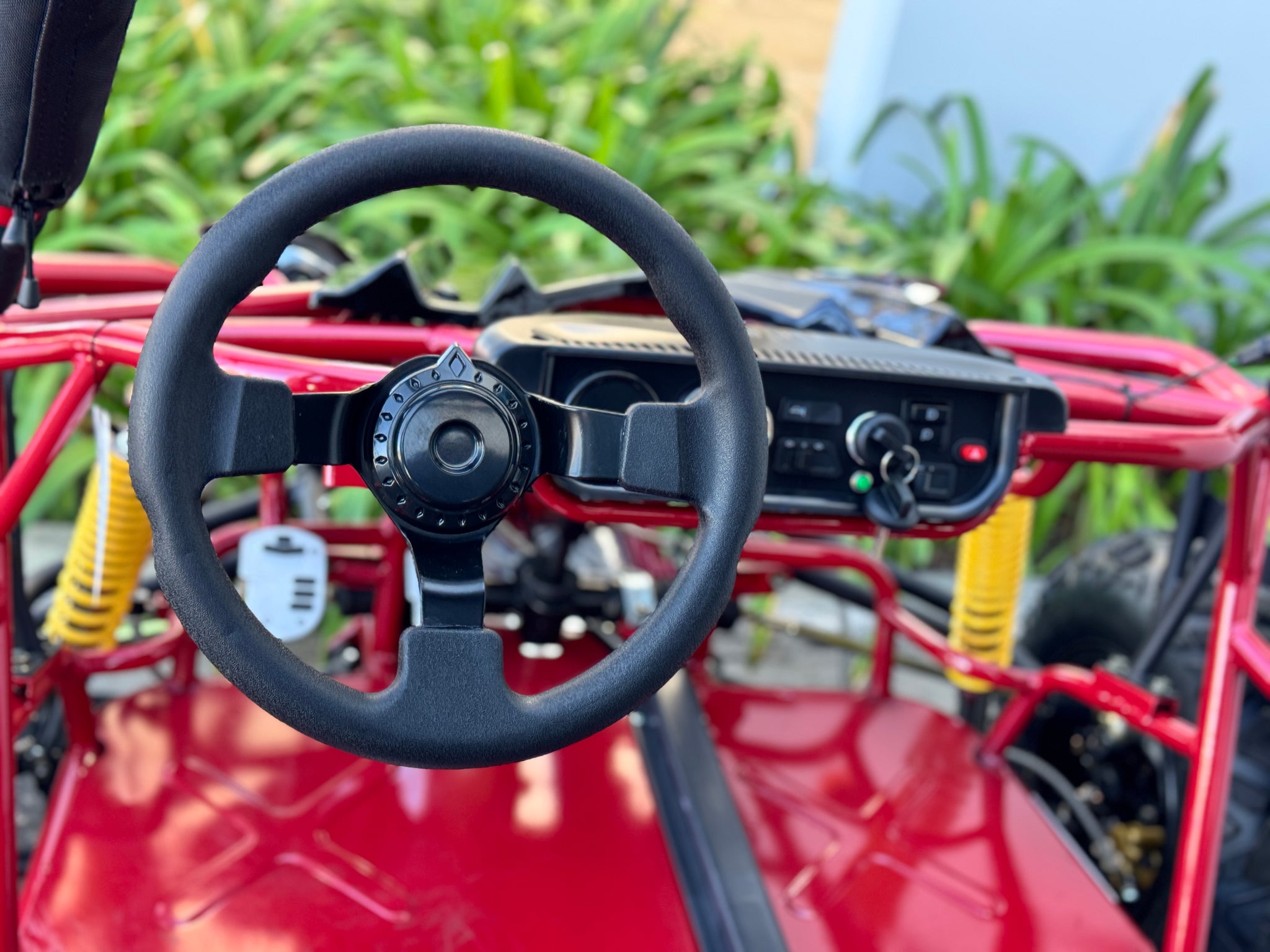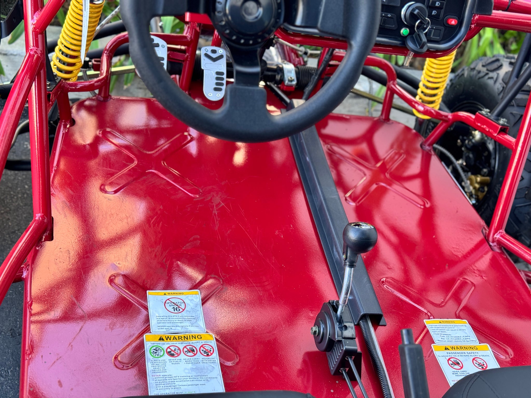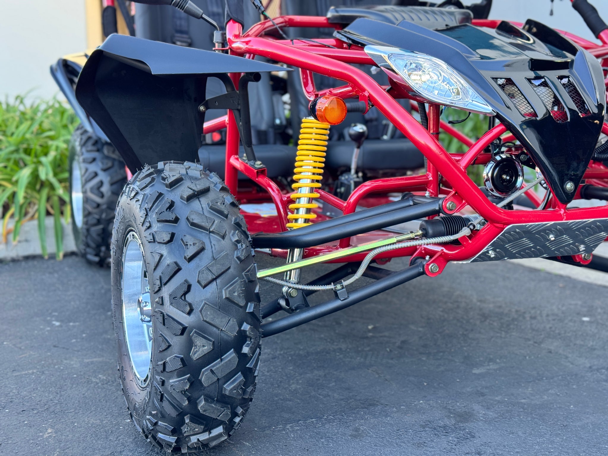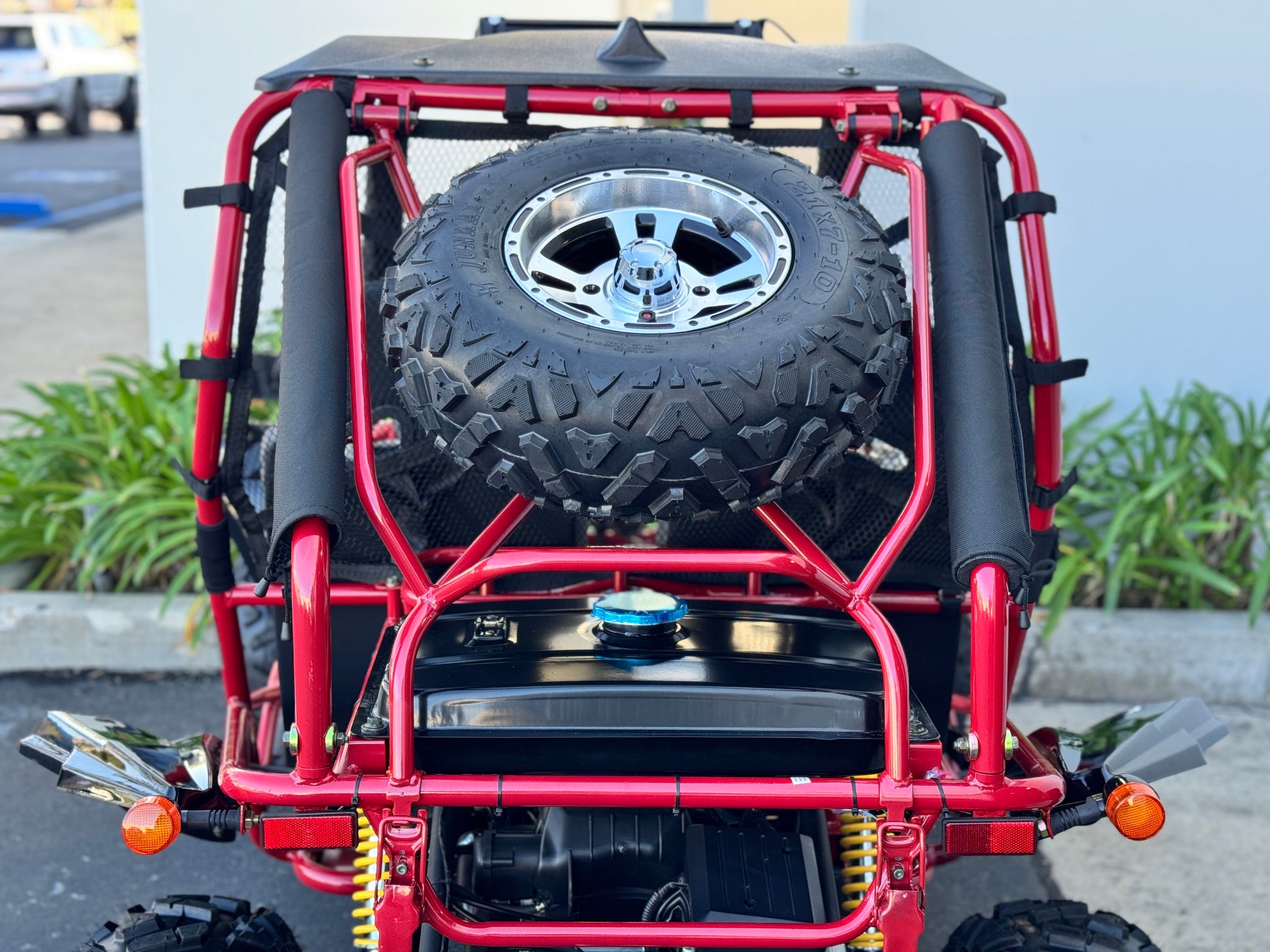 The 200cc Venom Captain Go Kart is a fully automatic 2-seater dune buggy with carbureted engine, headlights, chrome wheels, signal lights, seat belts, free spare tire and other premium features.