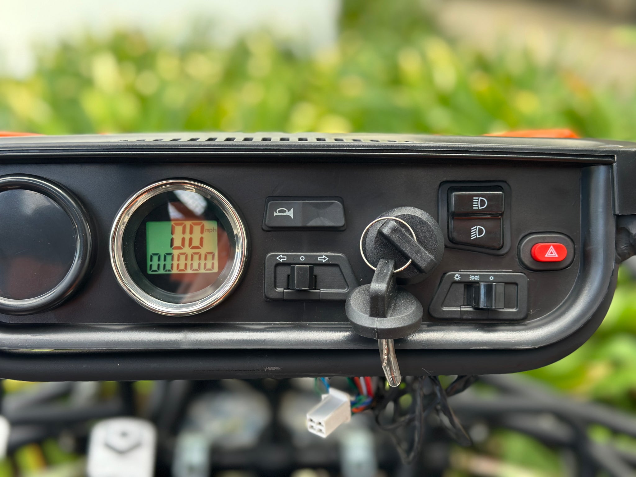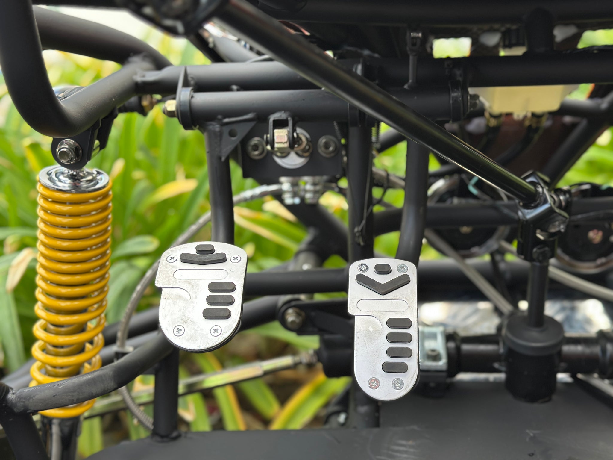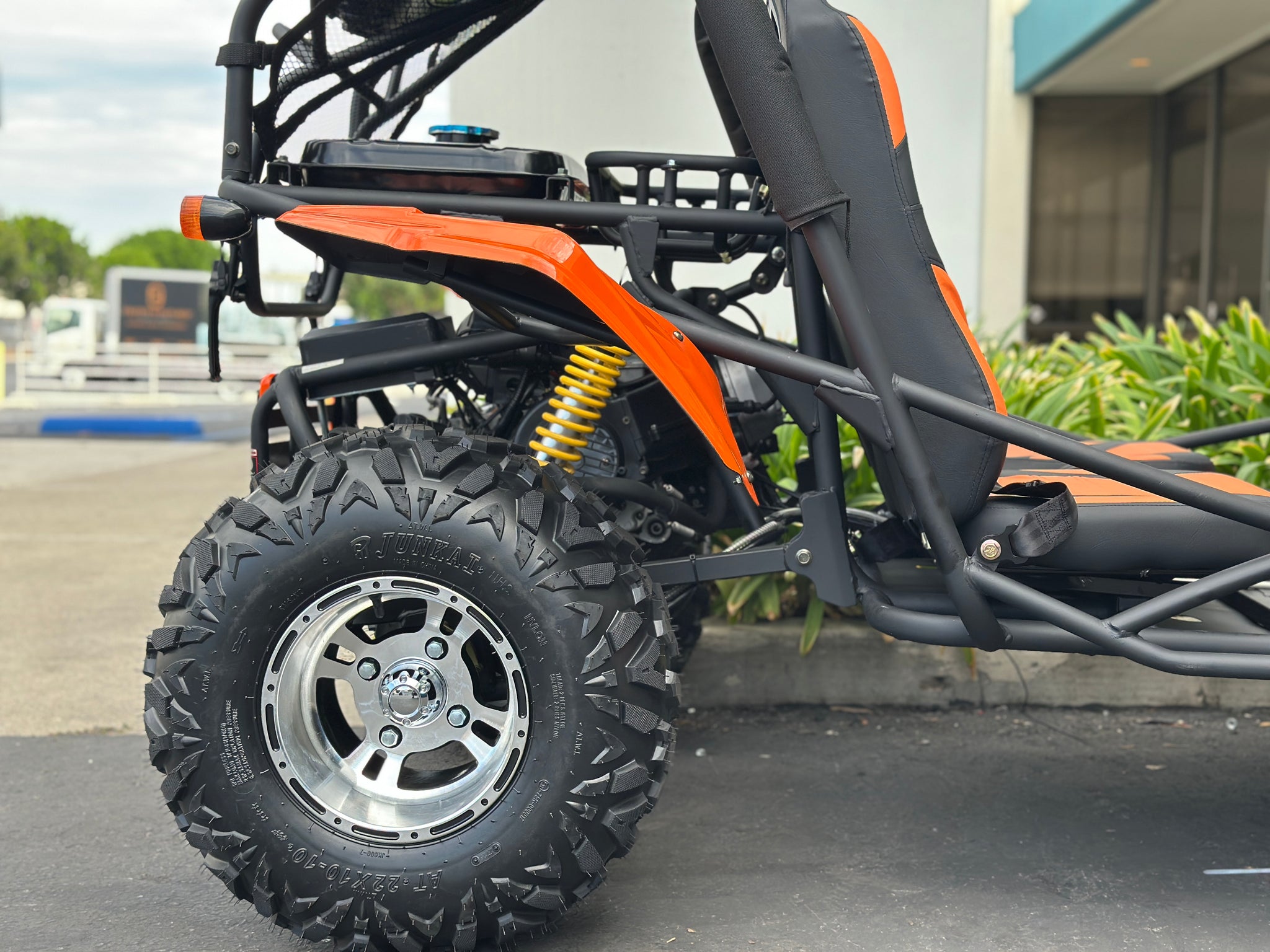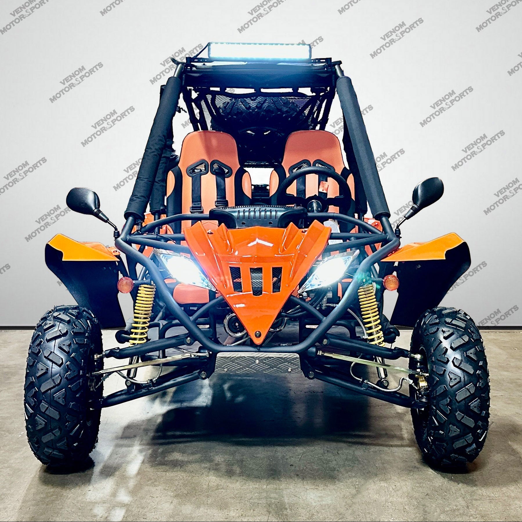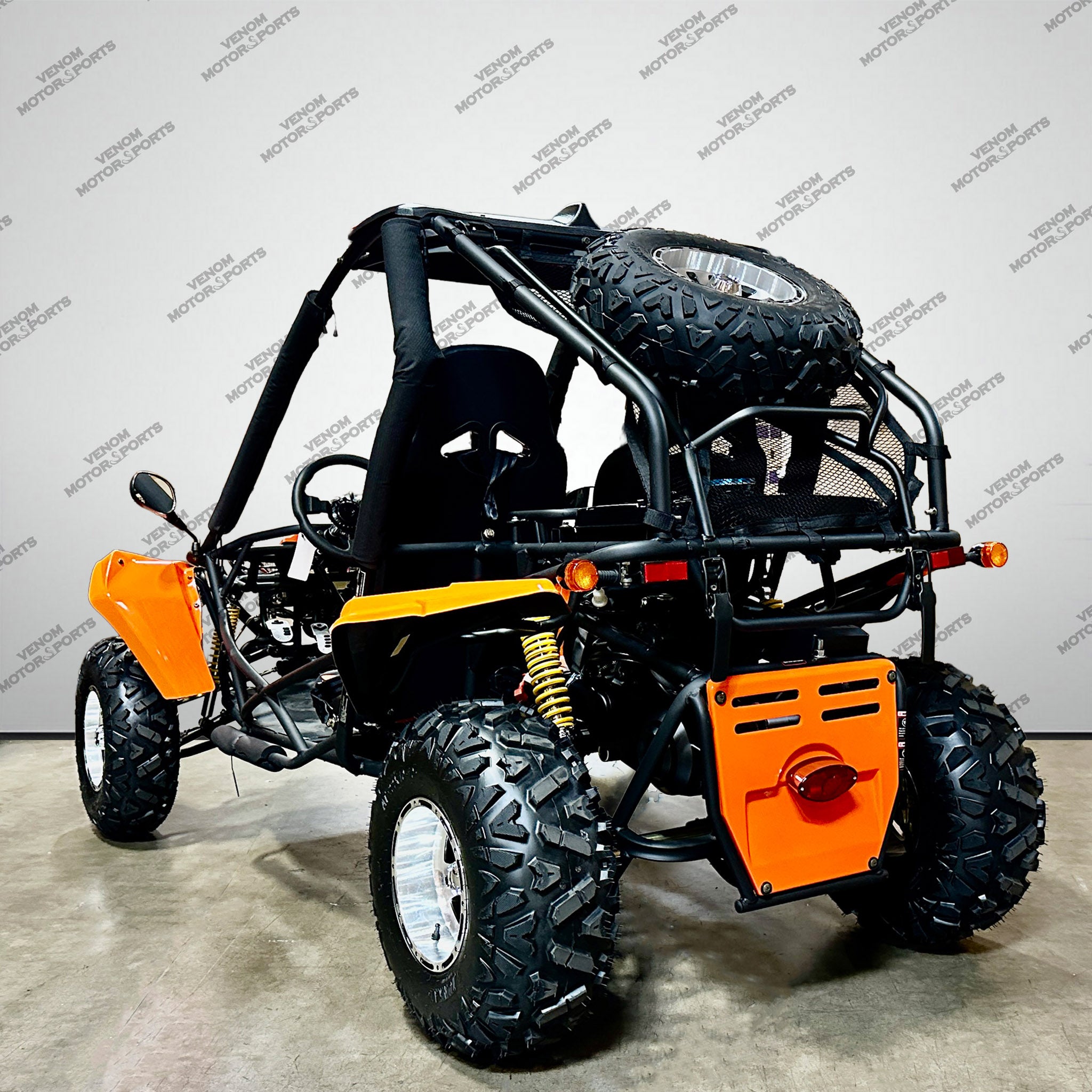The 200cc Venom Captain Go Kart is a fully automatic 2-seater dune buggy with carbureted engine, headlights, chrome wheels, signal lights, seat belts, free spare tire and other premium features.