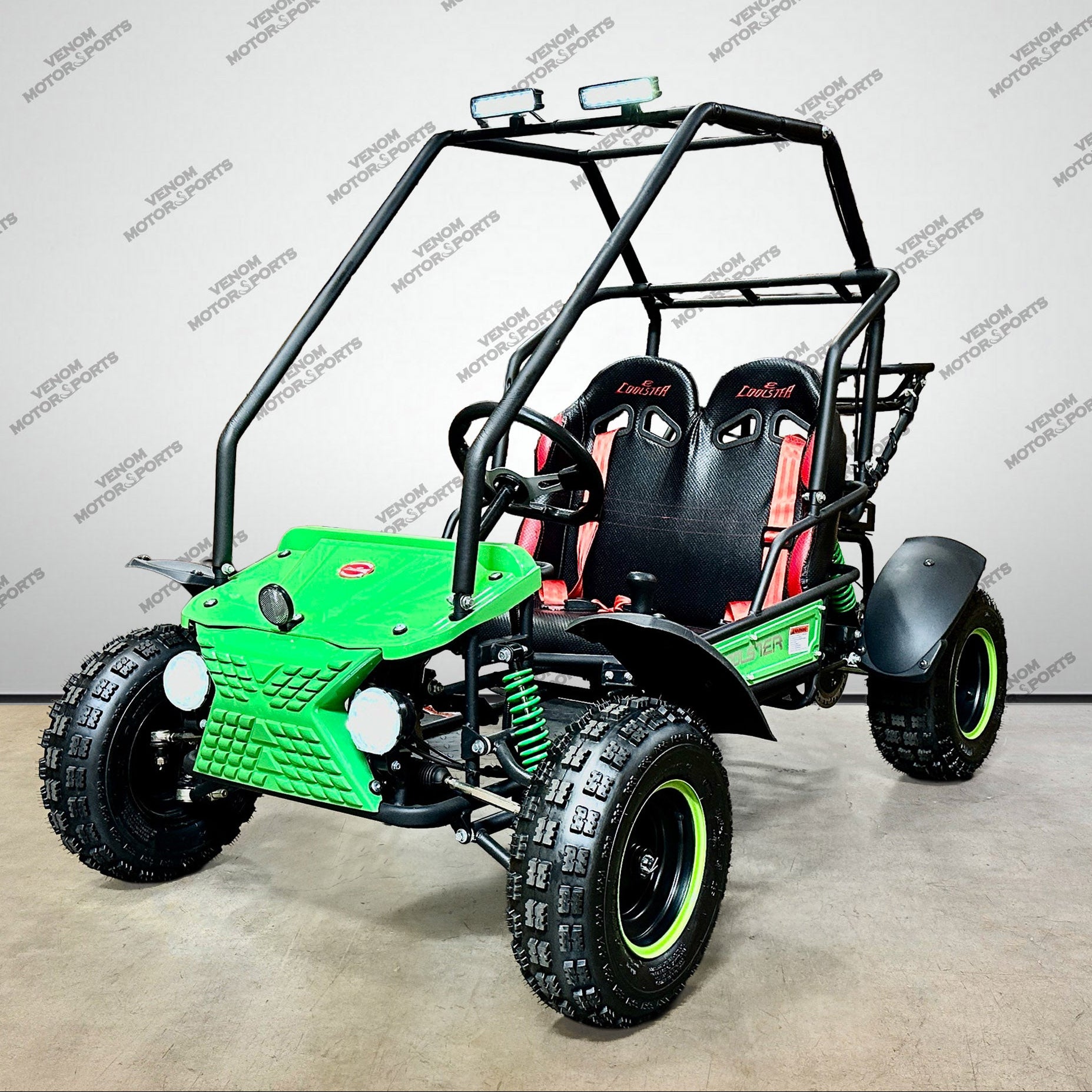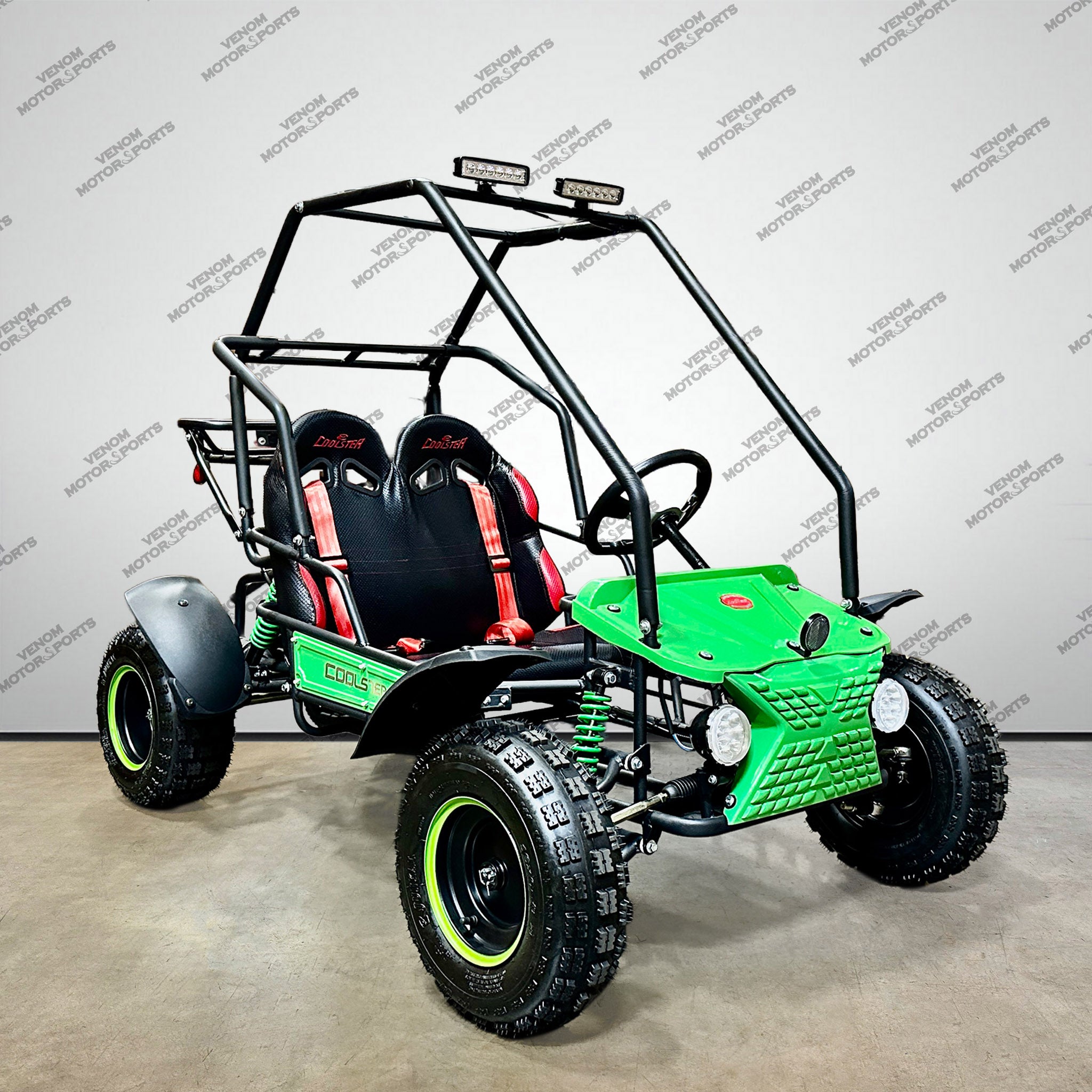 The Venom Ultimate Go Kart is the perfect choice for young adventurers. With a spacious two-seater design, LED headlights for enhanced visibility, and a speed governor for added safety, this gas-powered dune buggy offers an unforgettable driving experience. Easily controlled with its fully automatic transmission and reverse function, this 125cc go kart is sure to provide hours of thrill and excitement.