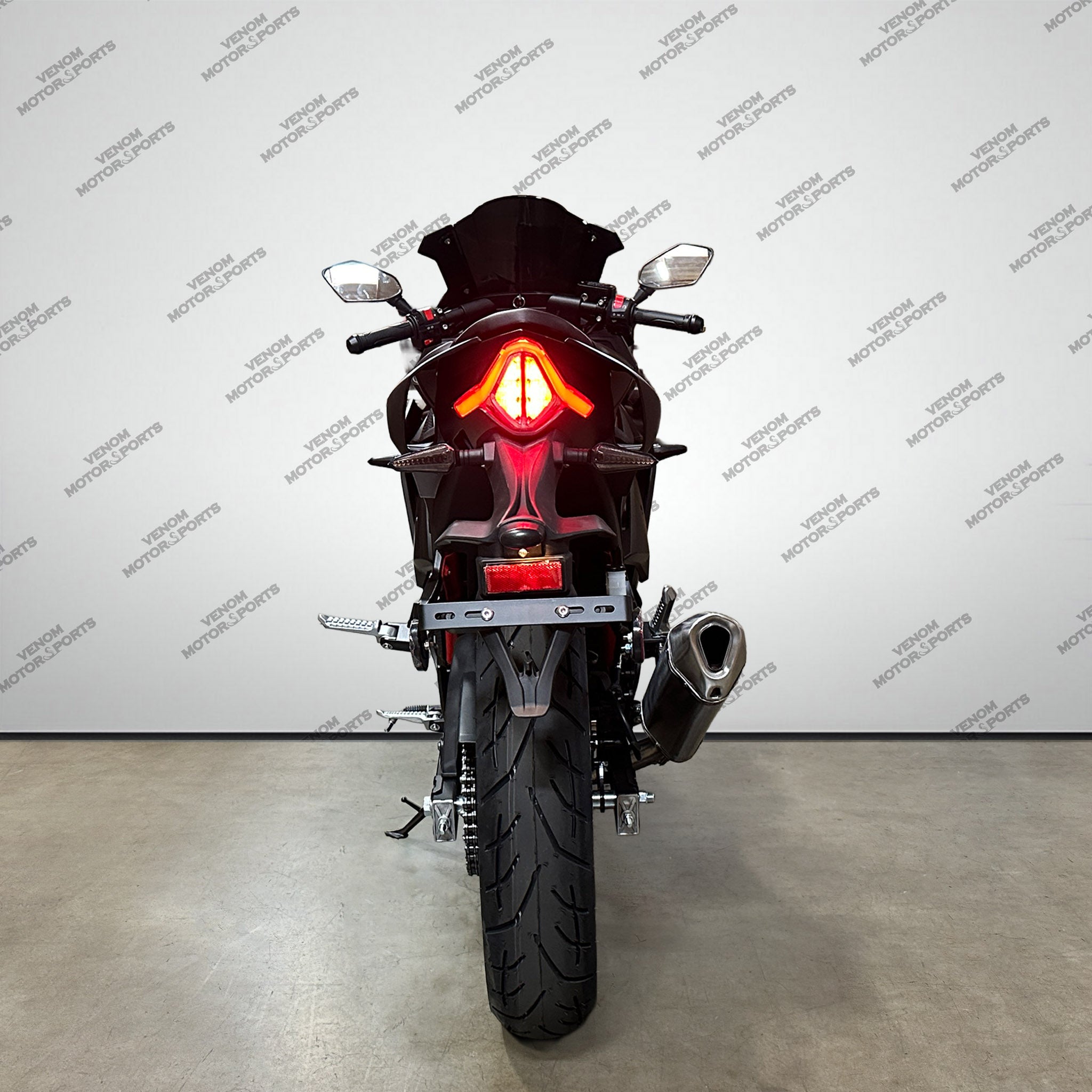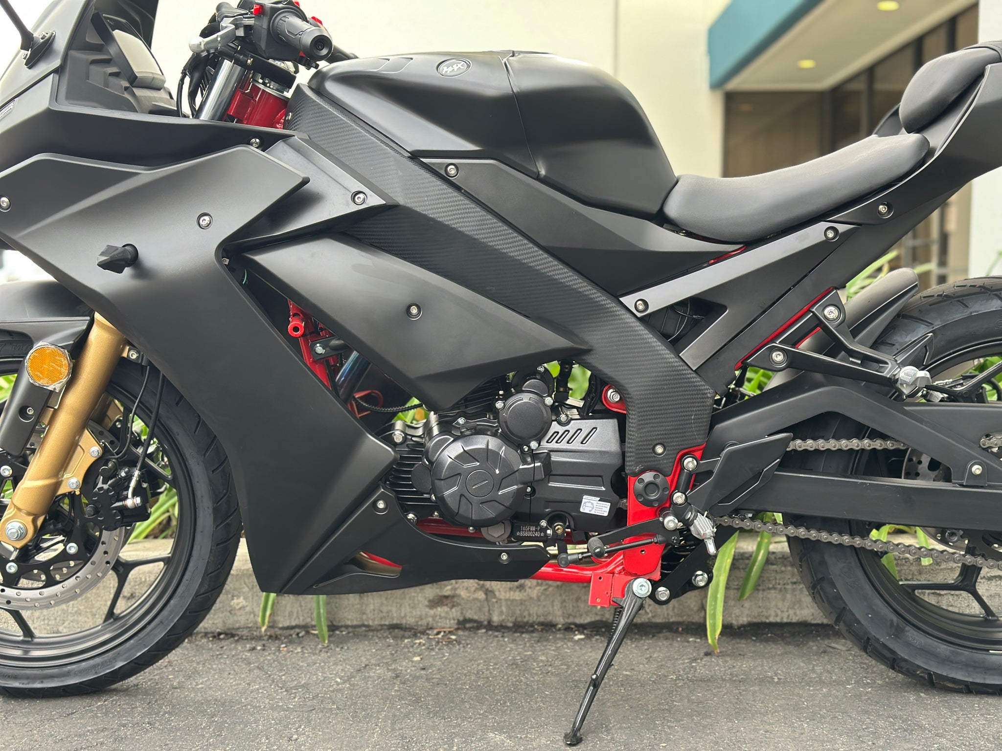 The Venom X22RR EFI 250cc is the first of the Venom "Double-R" series. It delivers a refined entry point into street riding with its fuel-injected single-cylinder engine and 6-speed transmission, engineered for smooth power delivery and highway capability. The rigid powder-coated steel frame in red provides structural integrity, while the dual-optic headlight assembly with integrated LED eyebrow strips ensures superior visibility and modern aesthetics. Installed gold front shocks offer a responsive suspension. Fully street and freeway legal, this machine combines practical engineering with contemporary styling—ideal for riders transitioning from smaller displacement bikes to highway-capable performance.
